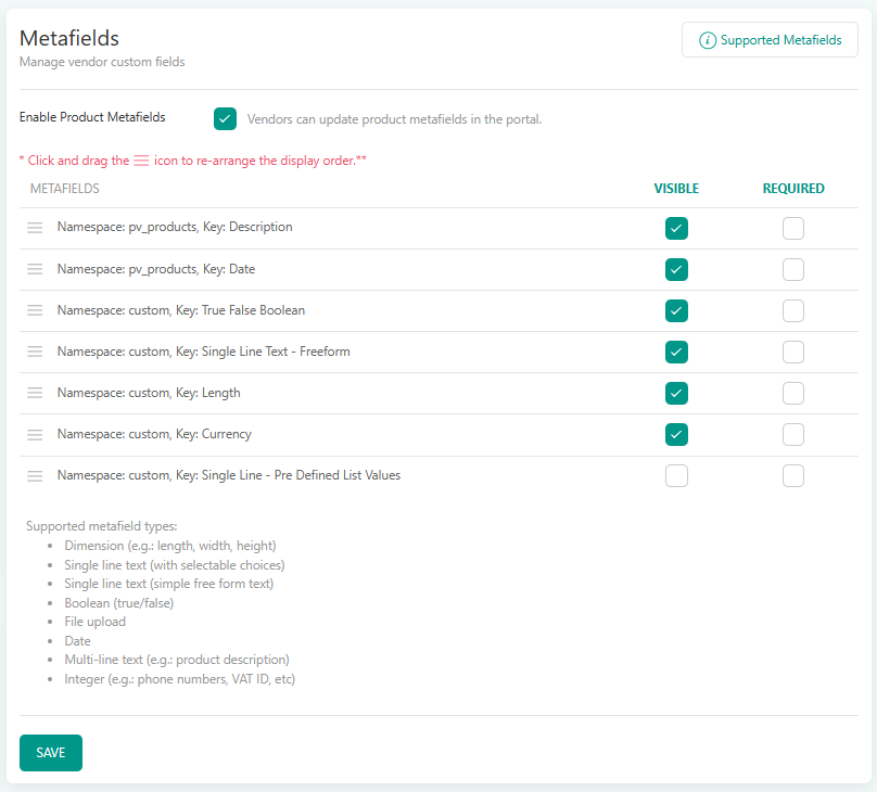 We’ve enhanced the Product Metafields configuration to give merchants greater control and flexibility. You can now define which metafields are visible and required at the product level. Additionally, metafield ordering has been optimized—fields can now be rearranged via drag-and-drop, allowing for faster customization.